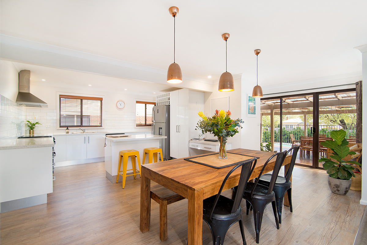 – Open plan kitchen looks over huge living and dining areas with woodfire heating and reverse cycle air conditioning