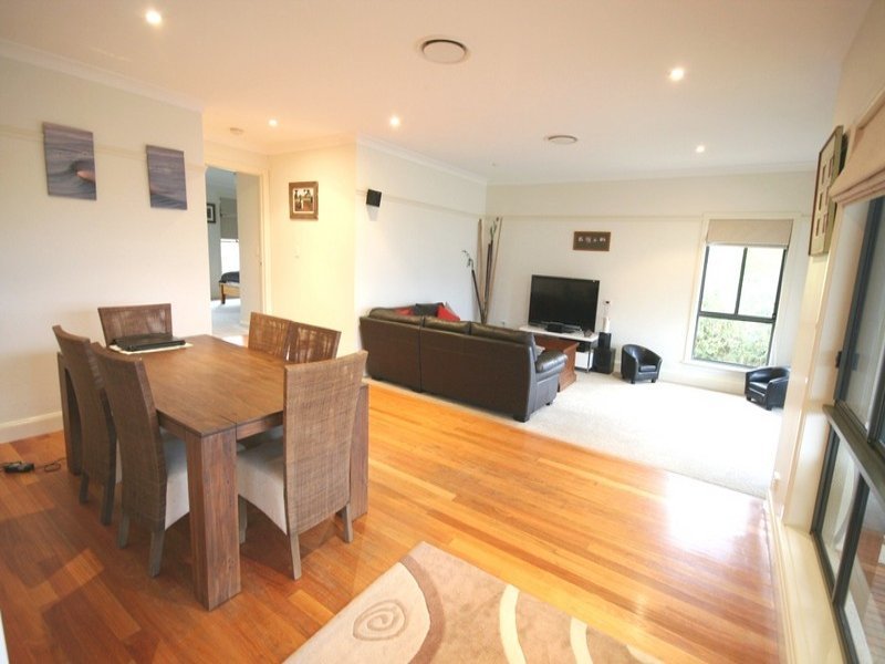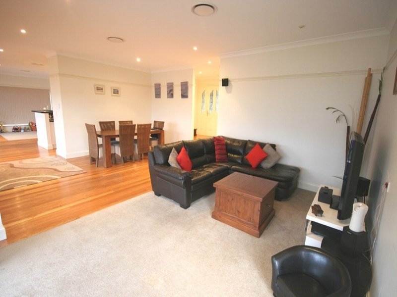 The living space consists of an open plan living/dining area with polished timber flooring and a family room with carpeted flooring.
