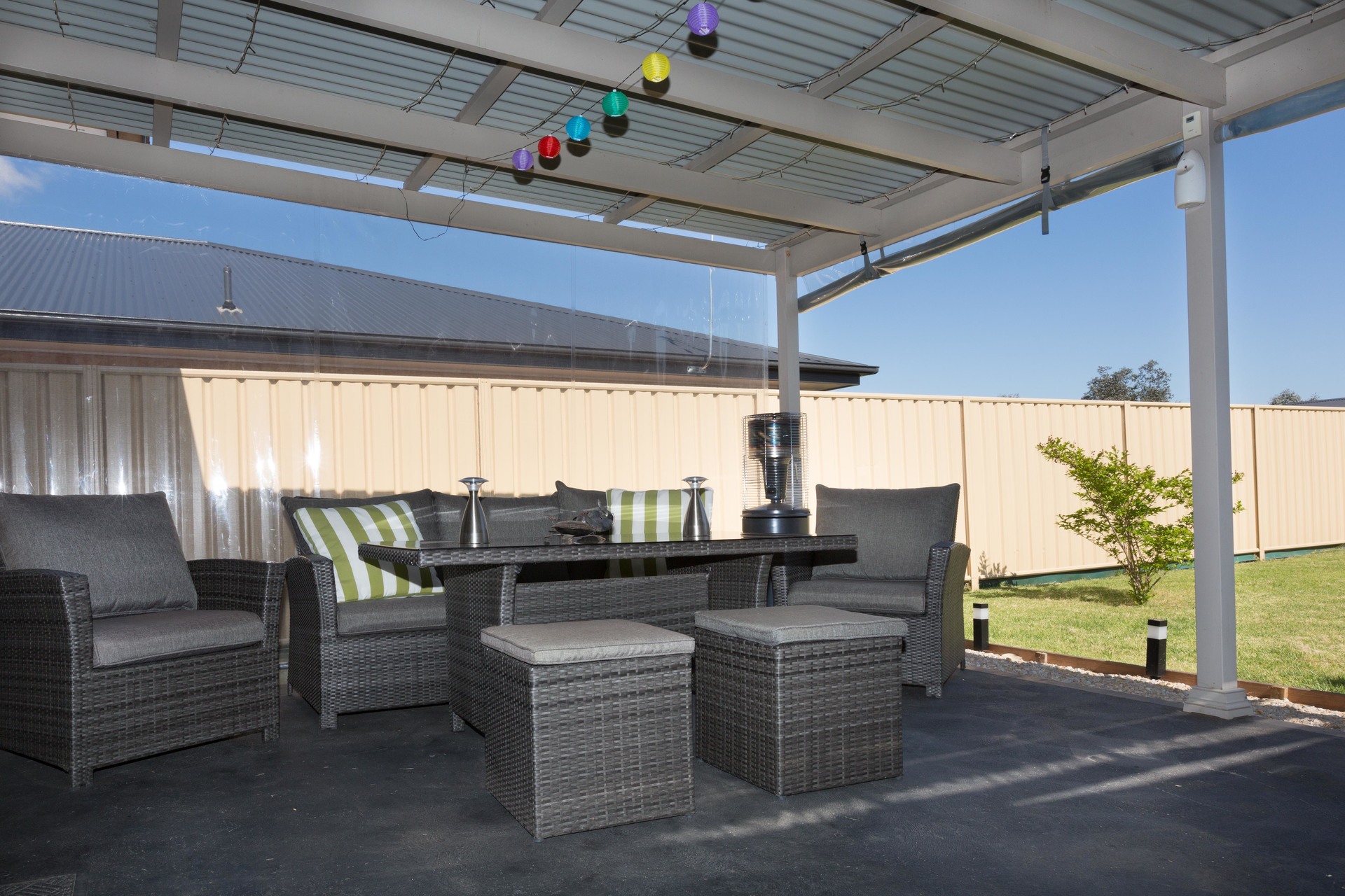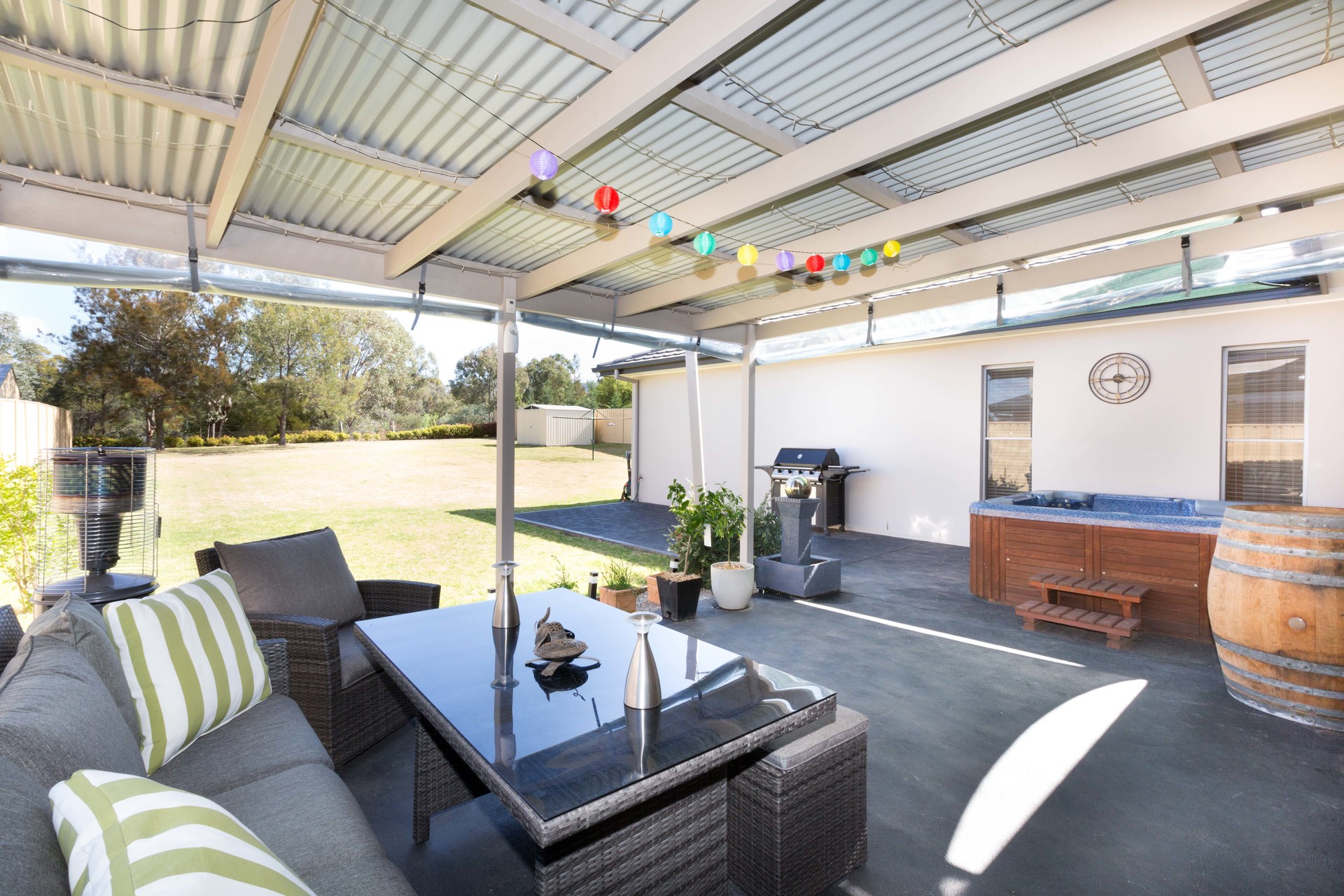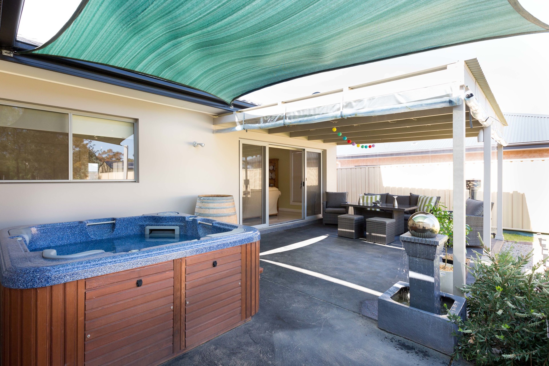 – A covered rear pergola and sail covered patio provides great entertaining space