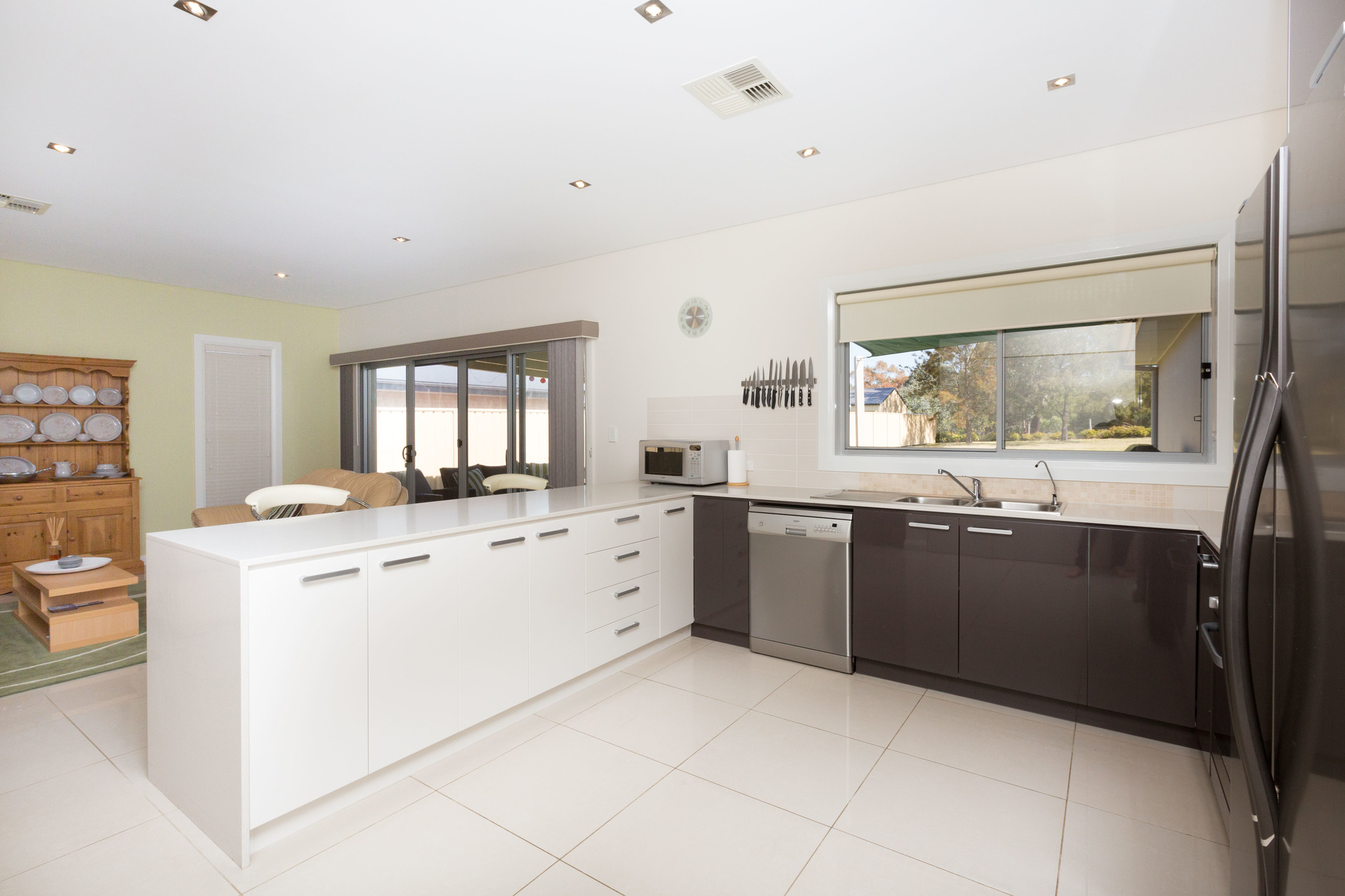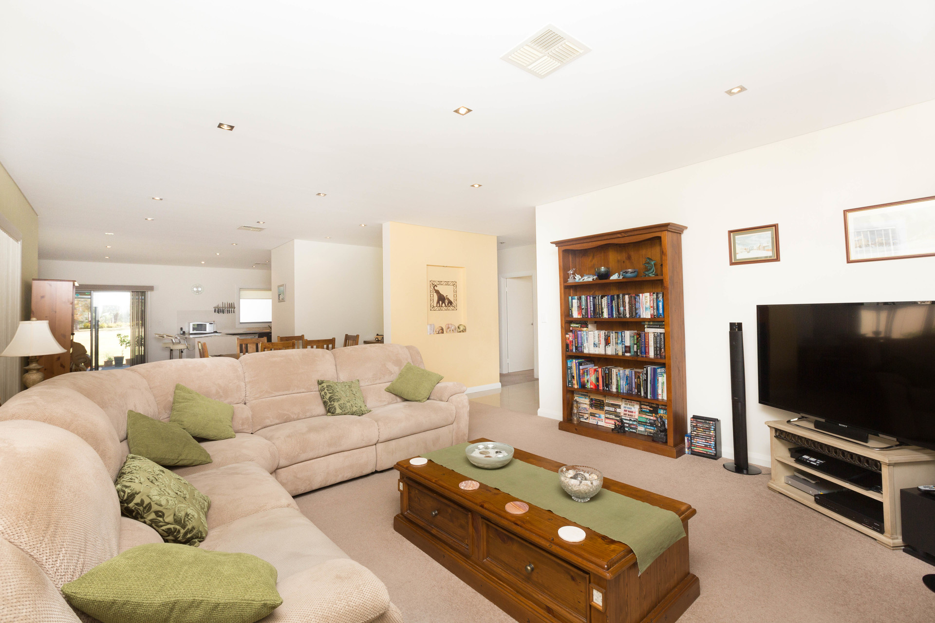 – The open plan living space has a designated lounge and dining areas