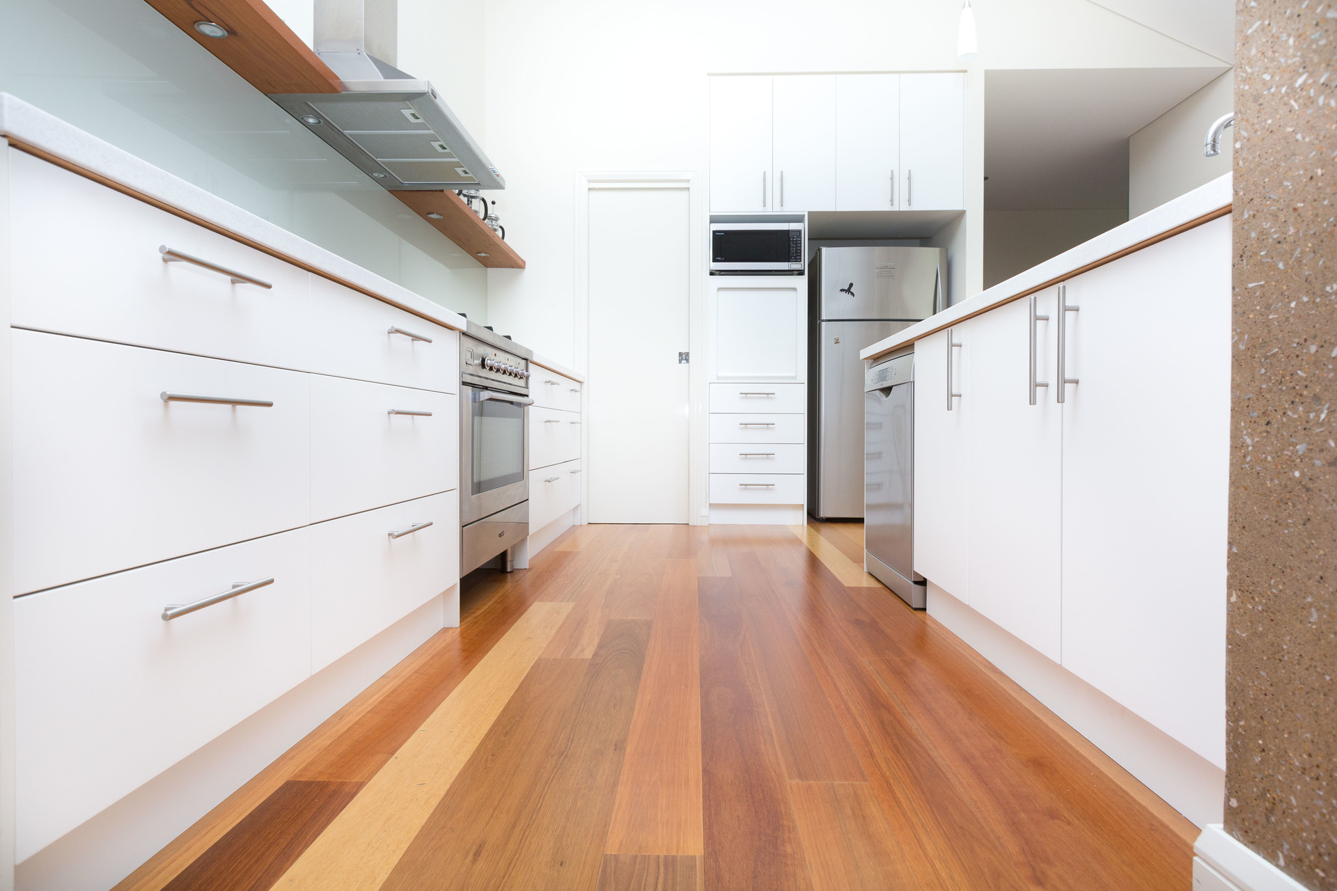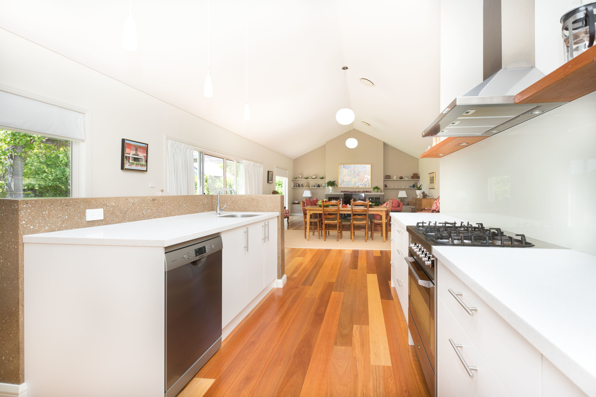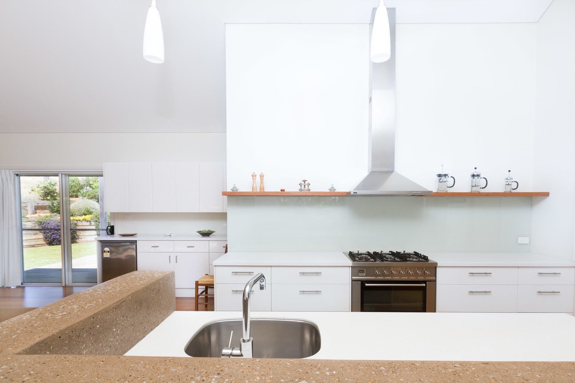 – Polished concrete in the island bench, Ilve oven, Bosch dishwasher, walk in pantry and glass splash back create a beautiful kitchen