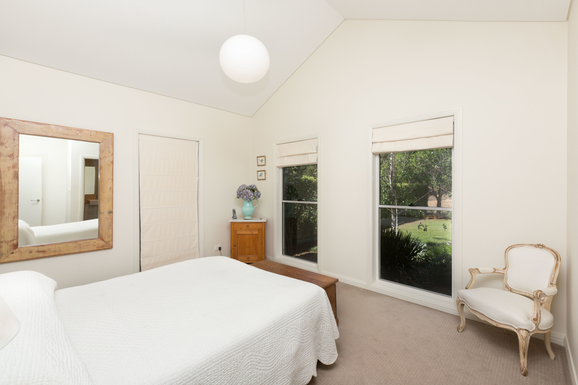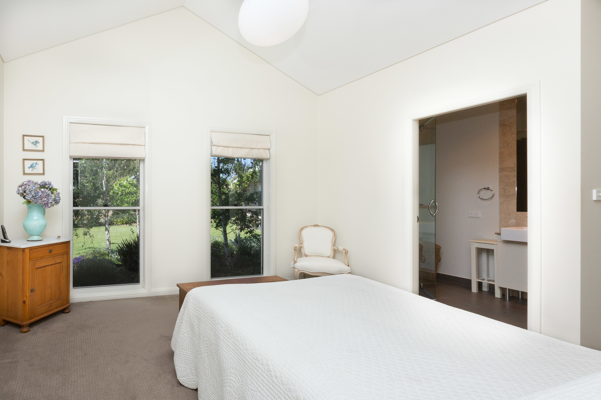 – Serene master suite has high raked ceilings, garden outlook, walk through robe with built-in cabinetry and an ensuite bathroom