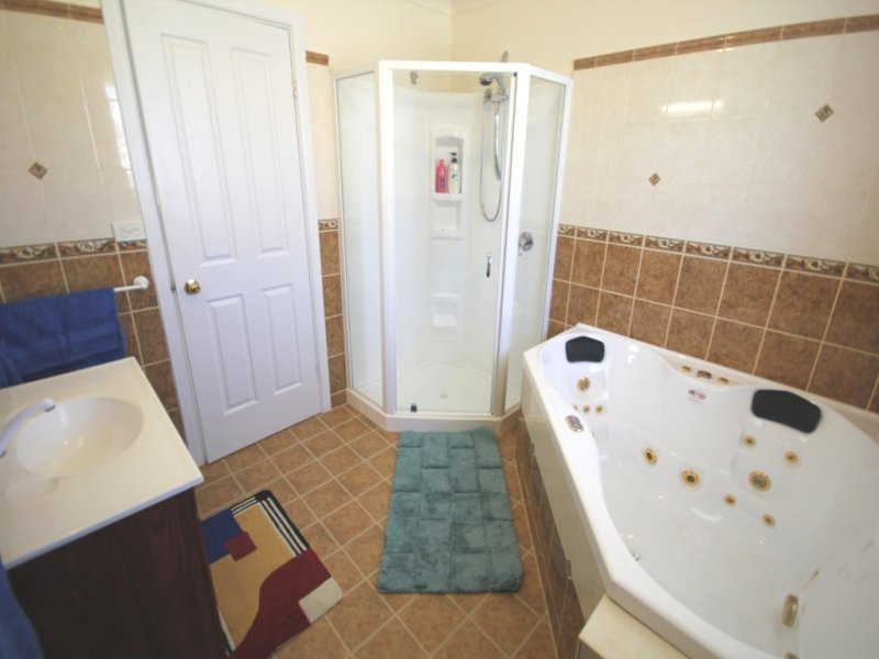 With an inviting two person corner spa and quality tiling, the bathroom also has a shower and toilet.