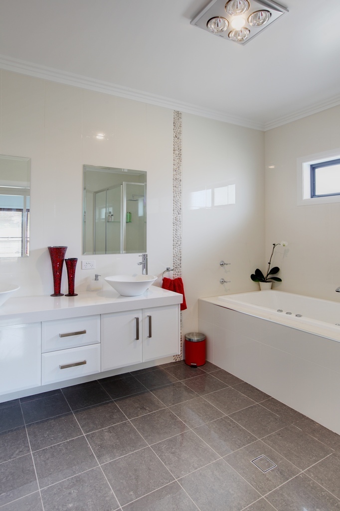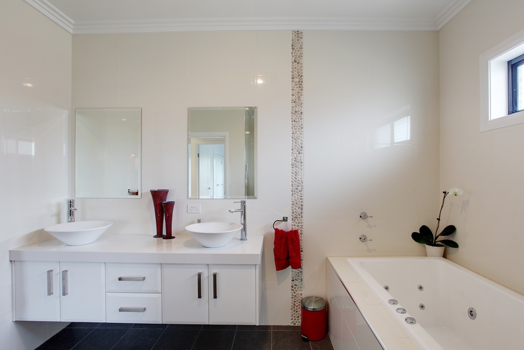 An enormous main bathroom has a wall hung double basin, deep spa bath and large shower. Both the ensuite and main bathroom have walls tiled to the ceiling, touch pad temperature control for hot water and the tap fittings and shower heads are exquisite.