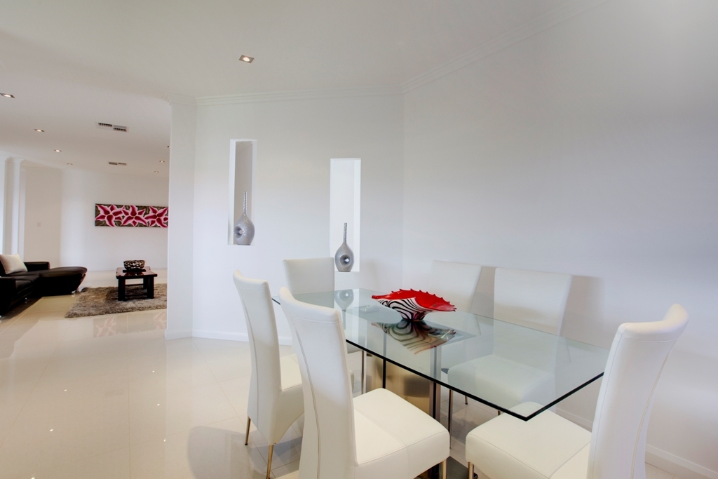 The brilliant kitchen boasts dazzling glass splash backs, stone bench tops and breakfast bar, quality stainless cooking appliances and dishwasher and superb cabinetry with “soft close” hinges. The dining area is adjacent.