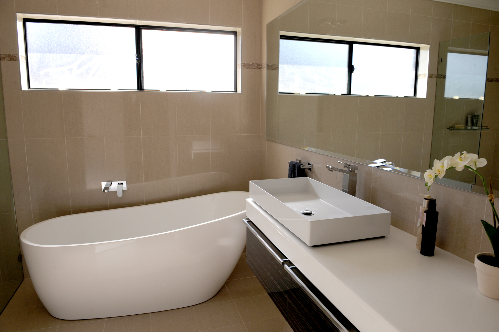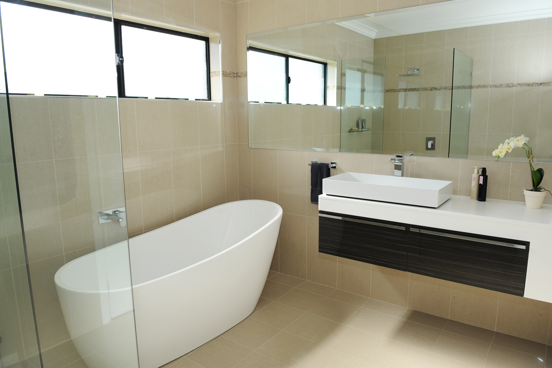 – Inviting main bathroom, tiled to ceiling, freestanding bathtub